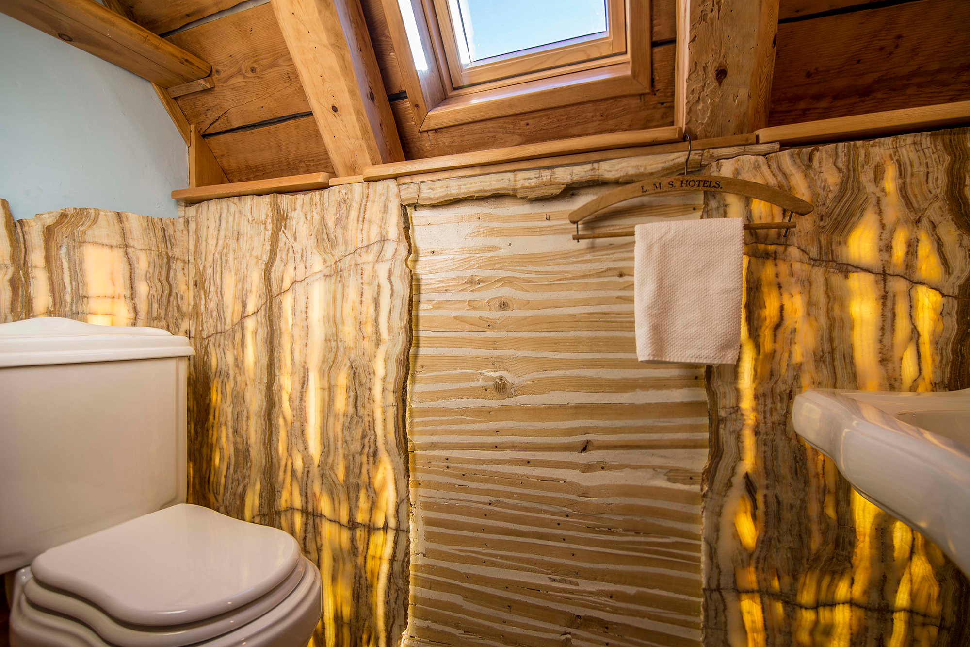 La casa disposa de 5 banys, cadascun amb característiques arquitectòniques especials, sigui per la ubicació, dins un armari, una antiga cabina de telèfon o una xemeneia o pels materials empleats, ònix mil·lenari i fusta de teca o de pi.