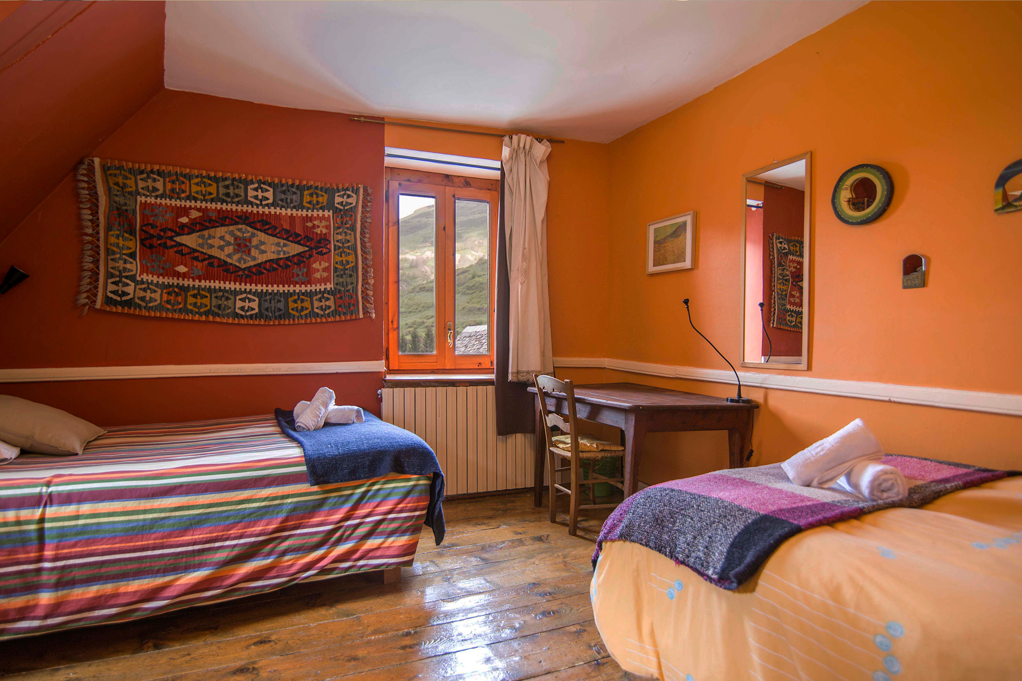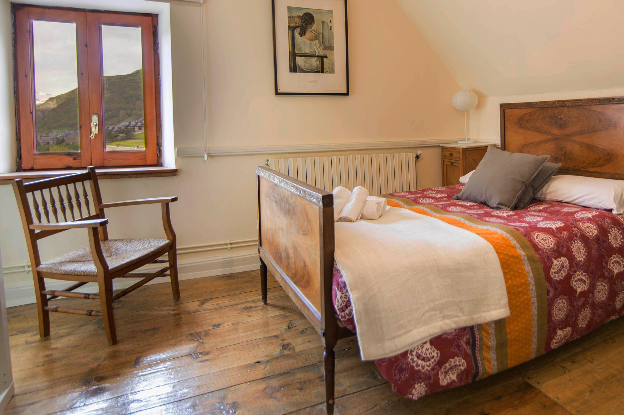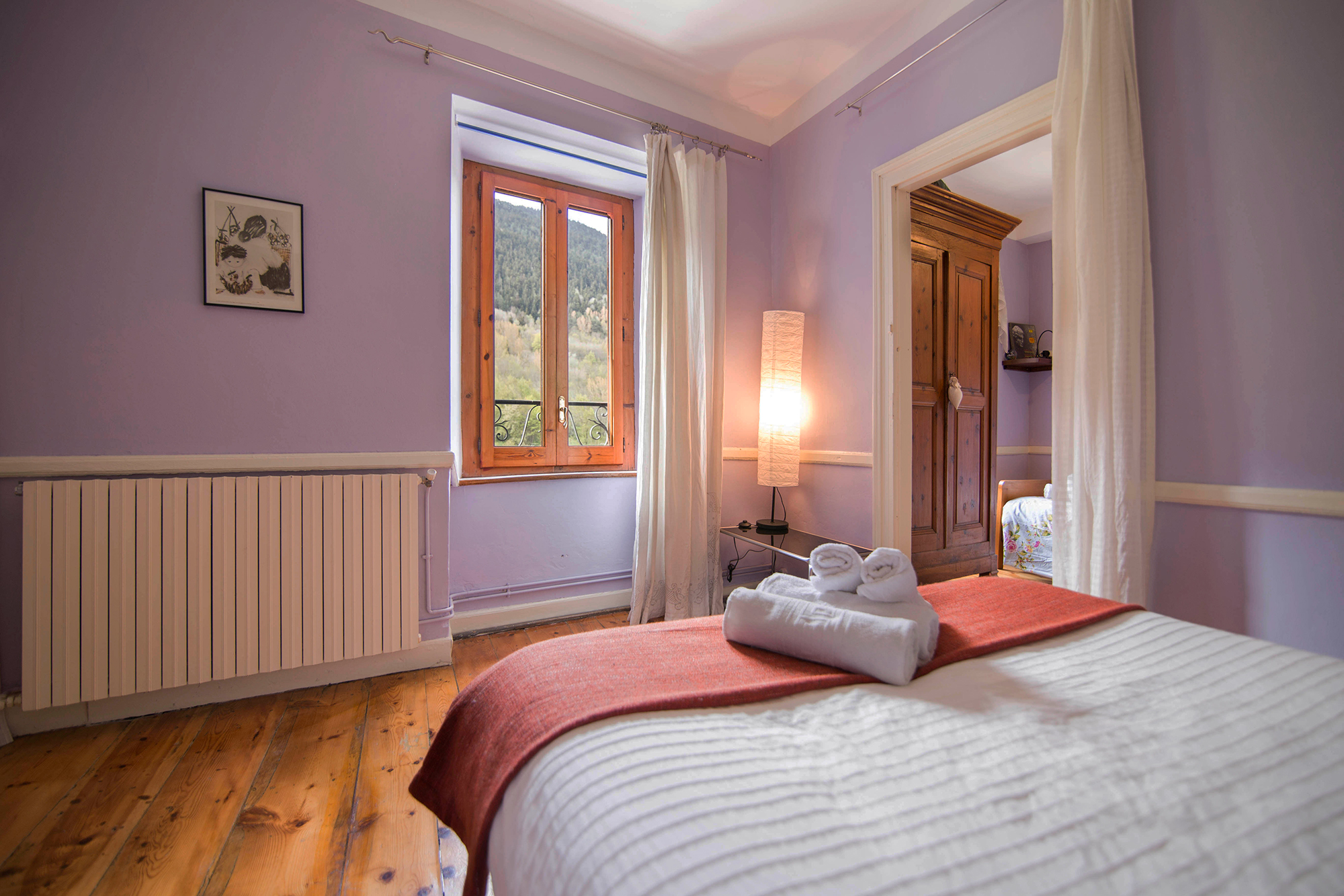 Totes les habitacions són exteriors amb finestres i vistes a la natura, al bosc de Mont-Romies i a la glacera de l’Aneto (Hab. 1-2-3-5-6-7) i al Pui d’Unha i passatge Major (Hab. 4). Lluminoses, amb sostres alts, parquet de fusta d’avet centenari i espaioses (entre 18 i 35 m²). Equipades amb mobiliari antic i matalassos confortables.