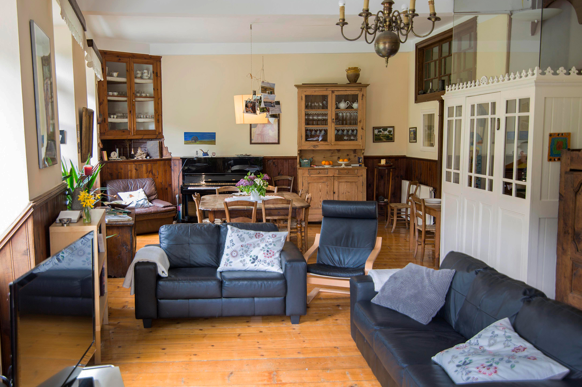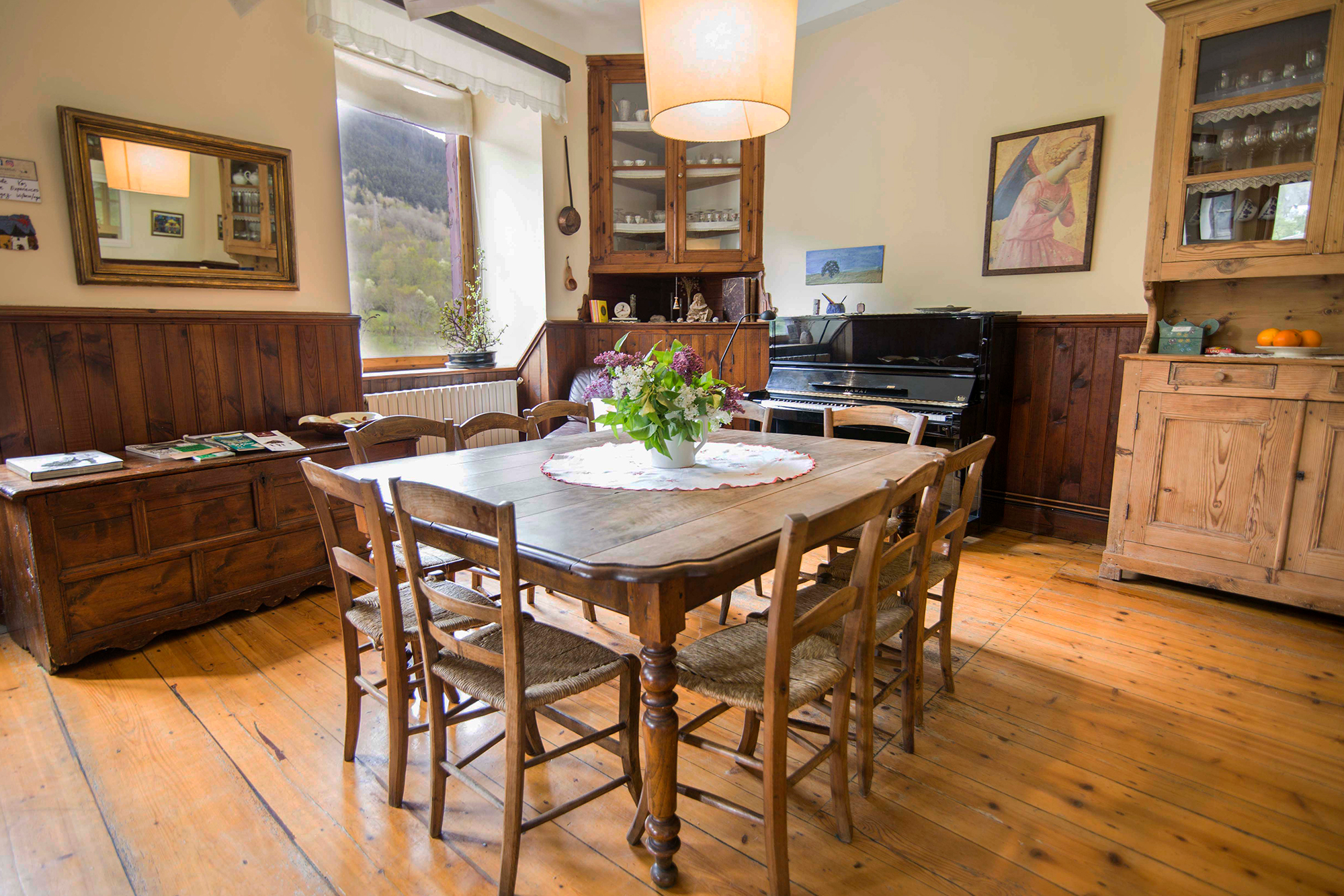 La casa ofereix  el plaer de gaudir de la llum, l’espai, els volums i les vistes. 4 plantes i 7 espaioses habitacions. Fusta noble arreu: arrimadors de melis i terres de paquet de 35 m/m d’avet centenari amb reforços de roure a l’escala.  Gran saló de 65 m2 amb ventanals, terrassa i balcó, i sostres de 3,20 m amb piano Kawai i taula central de fins a 18 comensals.  Wi-fi amb fibra óptica. Fàcil accés i parking: Una plaça privada a la porta i 11 de públiques al costat.